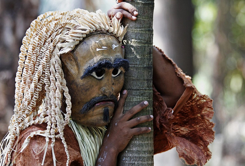 节日中一名舞者靠着树休息。