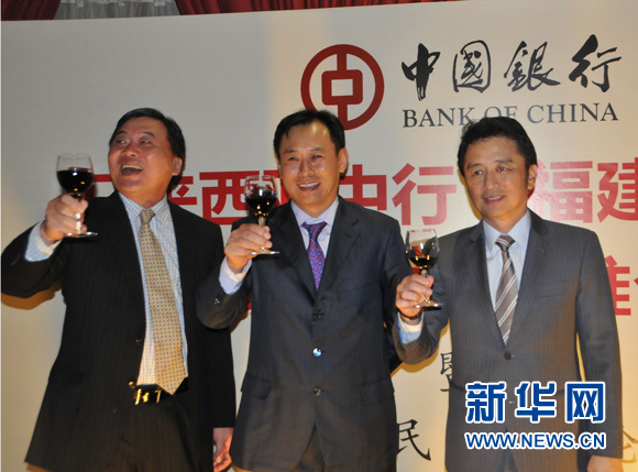 马来西亚中国银行总裁王宏伟(中)、中国银行福建省分行行长陶以平(左)马来西亚中华总商会署理会长戴良业向嘉宾敬酒。