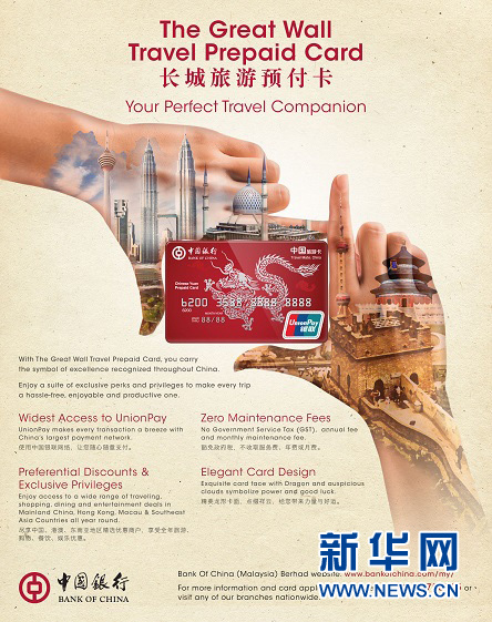 马来西亚中国银行方面人士5日表示,马来西亚中国银行将作为唯一指定金融服务银行参加将于8月8日在吉隆坡开幕的第13届马来西亚国际旅游展,并为广大游客及旅行社带来更多更好的旅游金融服务产品。图为中国中国长城旅游预付卡(Travel Mate)介绍。