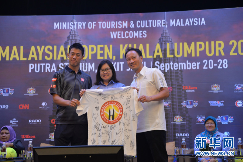 织锦圭(左)和张德培(右)向马来西亚旅游部代表赠送参赛球员签名球衣。
