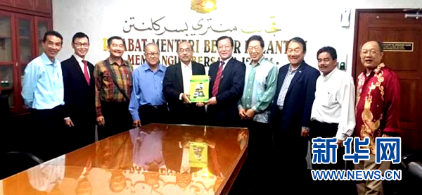 吉兰丹州工业、贸易和民族团结委员会主席陈升顿(左五)向夏宝文(右五)和黄汉良(右四)赠送吉兰丹州发展大蓝图。