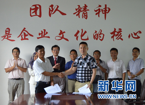 巴生港自贸区万商国际贸易联盟有限公司营运中心总经理董强(前右)和云南省大理州南涧县鑫凤凰茶叶有限公司董事长李世章(前左)签署了入驻协议。