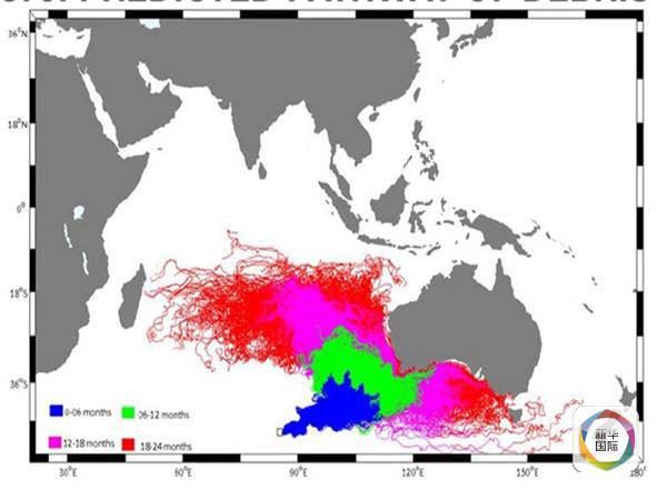 根据这个模型,MH370的残骸可能在18-24个月出现在下图中的红色区域,法属留尼汪岛就在红色区域内。