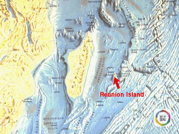 (留尼汪岛附近的印度洋海底地形图,红色箭头所指的为留尼汪岛,图上可见大面积隆起的海脊)