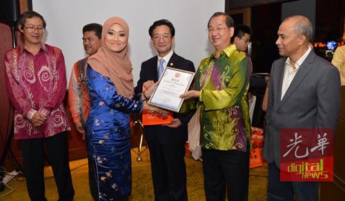 黄惠康(左4起)及吴恒灿颁发委任状及大使赠书予玛丽雅蒂(左3)。左起为胡吉华、扎哈拉你及沙克里。图自马来西亚《光华日报》