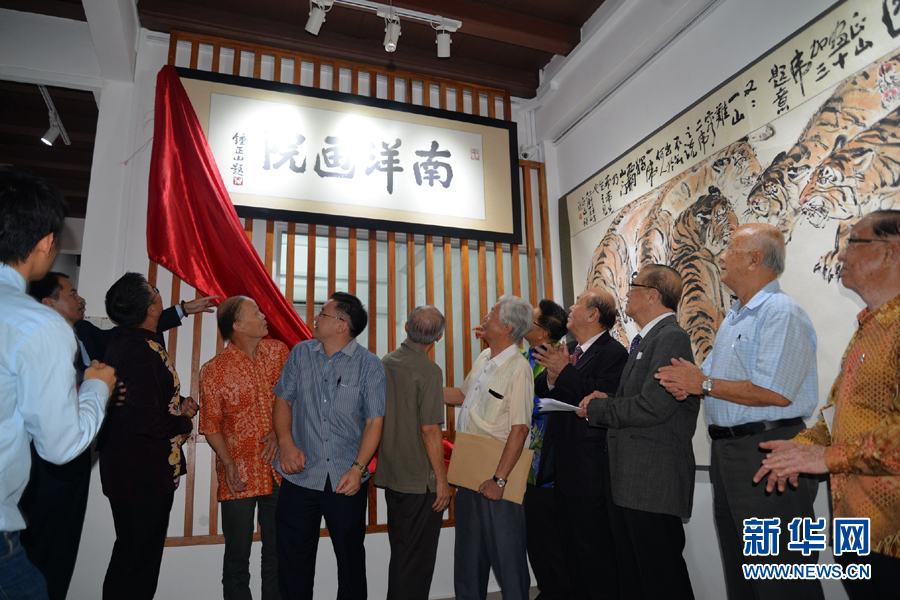 图为钟正山(右六)等嘉宾为马来西亚“南洋画院”揭牌。(王大玮摄)